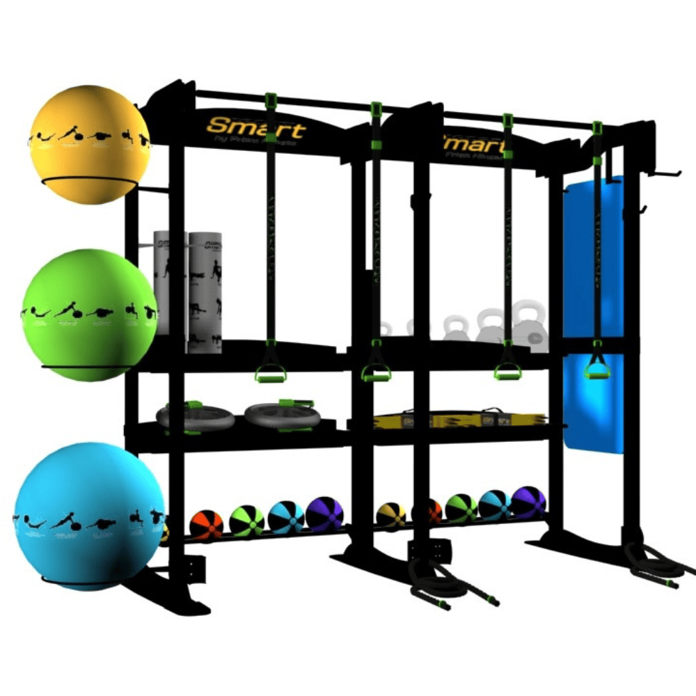 The Smart FTC Floor Mount 2 Bay Package includes one 2 Bay FTC rack with three storage trays, two rope anchors, two pull up bars, a mat rack, and two storage hooks for hurdles, one Smart Stability Ball 55cm, one Smart Stability Ball 65cm, one Smart Stability Ball 75cm, two Smart Medicine Balls each in 4LB, 6LB, 8LB, 10LB, and 15LB, six Smart Mats 16mm with grommets in black, two Smart Recovery Foam Rollers, two Smart Straps Body Weight Training Systems, two Smart Strength Bands each in light, medium, and heavy resistance, one Fitness Cable 20LB, one Fitness Cable 40LB, one Fitness Cable 60LB, three Smart Quick Flip Single Pocket Handles sold as pairs, two Conditioning Ropes 30FT with 1.5" diameter, two Smart Speed Jump Ropes, two Smart Core Ab Wheels with Mat, two Smart Sticks unweighted, two Smart Sticks weighted, one set of Smart Hurdles #5, one Smart Modular Agility Ladder, and one Smart 3 in 1 Plyo Cube.