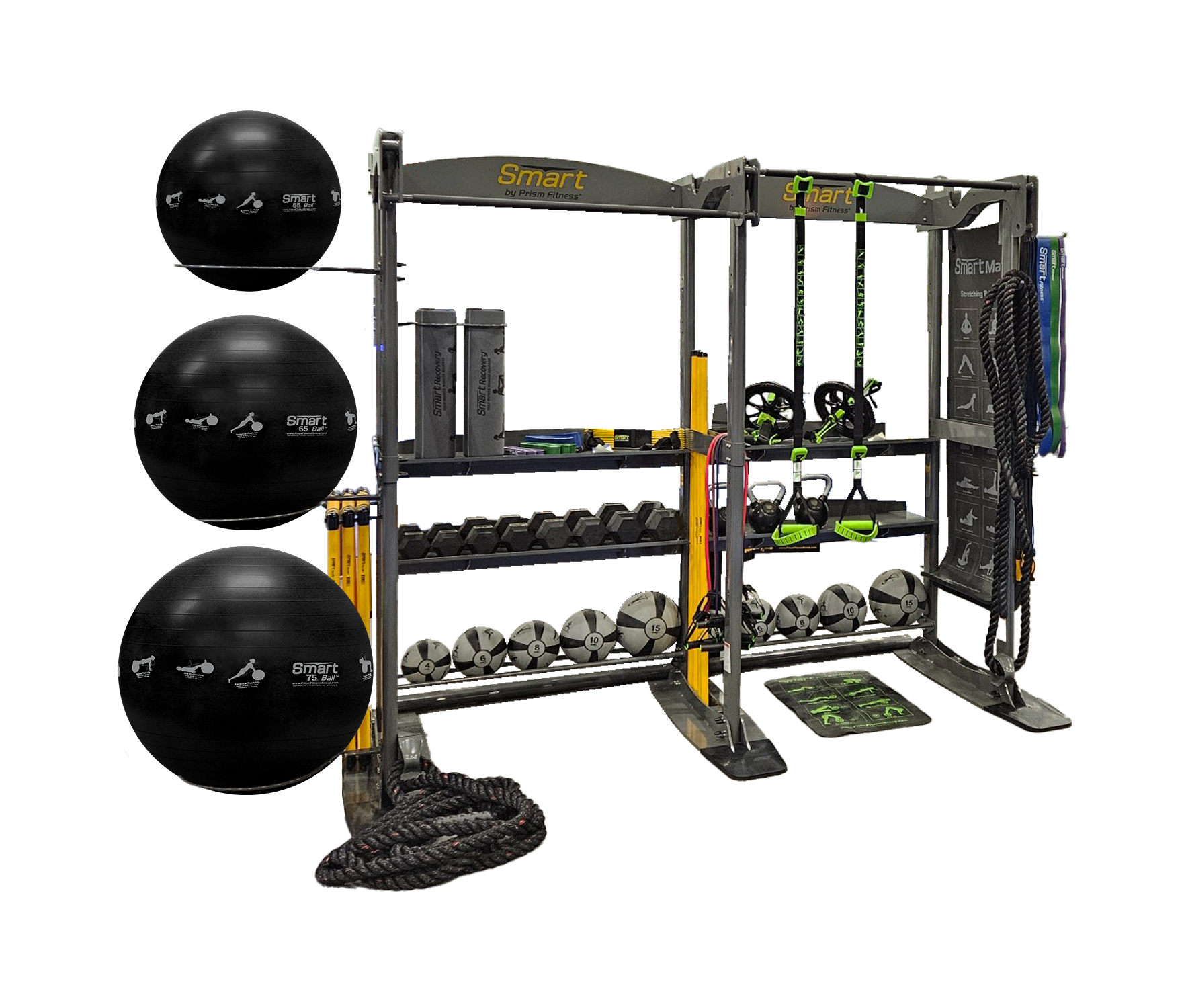 The Studio FTC Free Standing 2 Bay Package includes one 2 Bay FTC rack featuring three storage trays per bay, two rope anchors, two pull up bars, a mat rack, and two storage hooks for hurdles, one Smart Stability Ball 55cm in black, one Smart Stability Ball 65cm in black, one Smart Stability Ball 75cm in black, two Smart Medicine Balls each in 4LB, 6LB, 8LB, 10LB, and 15LB in gray, six Smart Mats 16mm with grommets in black, two Smart Recovery Foam Rollers, two Smart Straps Body Weight Training Systems, two Smart Strength Bands each in light, medium, and heavy resistance, one Fitness Cable 20LB, one Fitness Cable 40LB, one Fitness Cable 60LB, three Smart Quick Flip Single Pocket Handles sold as pairs, two Conditioning Ropes 30FT with 1.5" diameter, two Smart Speed Jump Ropes, two Smart Core Ab Wheels with Mat, two Smart Sticks unweighted, two Smart Sticks weighted, one set of Smart Hurdles #5, one Smart Modular Agility Ladder, and one Smart 3-in-1 Plyo Cube.