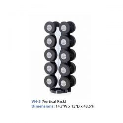 VH-5 (Vertical Rack) – Tthe cradles of the VH-5 are spaced wider to accommodate dumbbells with larger diameter heads including urethane, pro-style and solid steel. For added dumbbell finish protection and pinch resistance when re-racking, each dumbbell cradle is lined with protective nylon – and features heavy 12-gauge steel construction.