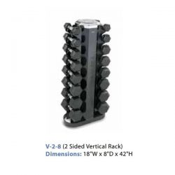V-2-8 (2 Sided Vertical Rack) – The vertical stacking design is space-efficient, which means it’s great for home use and use in small areas. The solid foundation keeps this rack stable at all times no matter what the dumbbell configuration. A special design means no pinched fingers when placing the dumbbells, and easy-to-read labels promote correct dumbbell placement. The protective vinyl cradle linings also assist in protecting the dumbbell handle finish from scratches and scuffs. The Two-Sided Vertical Rack holds any 8 pairs of compact dumbbells sized 2.5 thru 25 pounds.