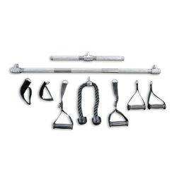 - Accessories: Long Bar, Sport Bar, 4-way Ankle Strap, Triceps Rope, 2 Short Strap Handles, and 2 Long Strap Handles.