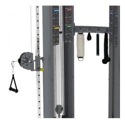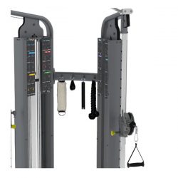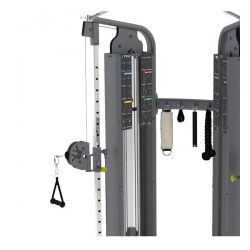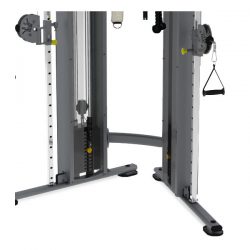 The pulley housings on the FS-100 Functional Trainer rotate 270˚ to allow movement in multiple planes. Users can select a multitude of vertical positions for the pulley housing, which are clearly marked 1-23 on adjustment tube, and are spaced in 3” increments. Dual 2:1 weight stacks allow users to choose different resistance levels or allows for two simultaneous users. Chrome plated chin bar offers multiple grip positions.