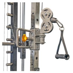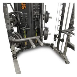 The dual-adjustable functional trainer comes with 2 x 200lb weight stacks and a pulley ratio of 2:1. Additionally, the counter-balanced Smith Machine counteracts the weight of the bar. When you load plate weights (sold separately) onto the bar – the weight you lift equals the amount you had loaded – you won’t have to account for the bar weight when figuring out what you’re lifting!